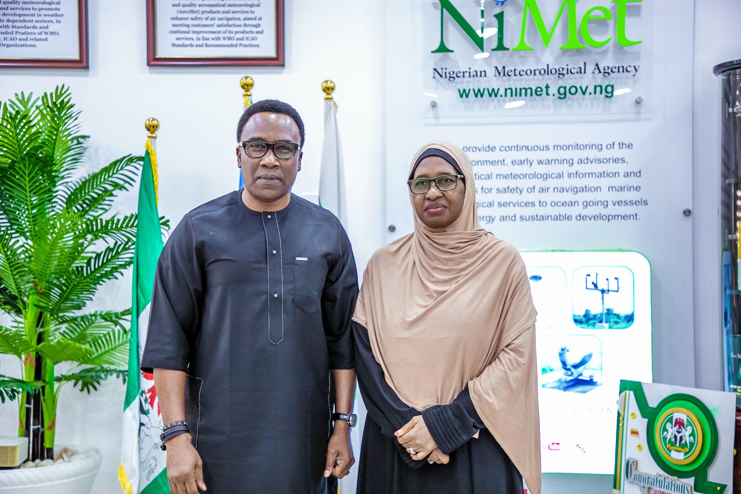Prof. Charles Anosike, Director General and Chief Executive Officer of Nigerian Meteorological Agency (NiMet) and Prof. Sa’adatu Hassan Liman, Vice Chancellor of Nasarawa State University, during a courtesy call on Prof. Anosike at NiMet Headquarters in Abuja on Tuesday
