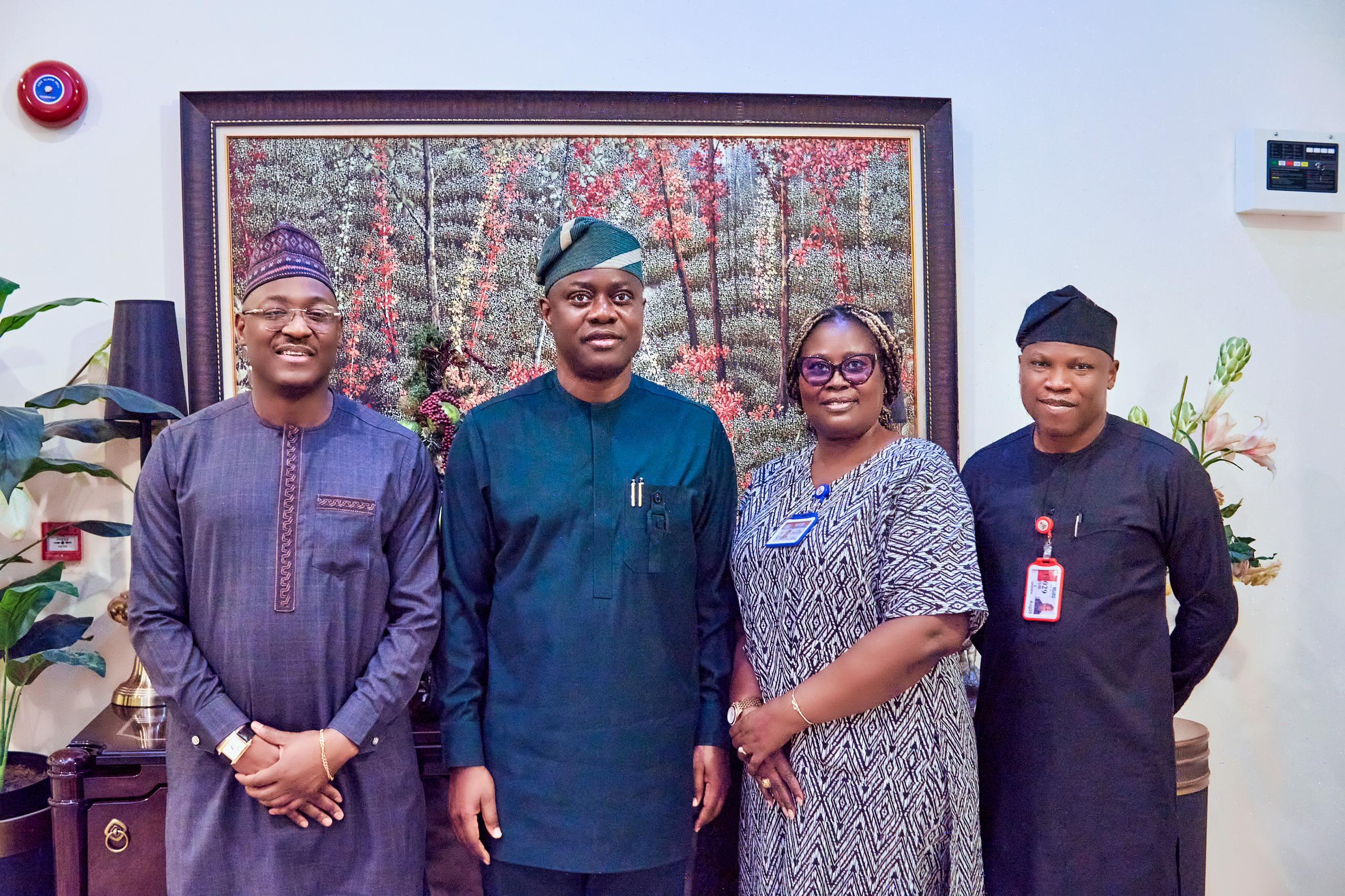 L-R: Captain Alex Badeh Jr – DG NSIB, H.E Engr. Seyi Makinde, Governor of Oyo State, Mrs Bimbo Oladeji, Director Public Affairs and Family Assistance, NSIB, and Captain Bunmi Gindeh, Special Adviser to the DG, NSIB during a courtesy call on the Governor
