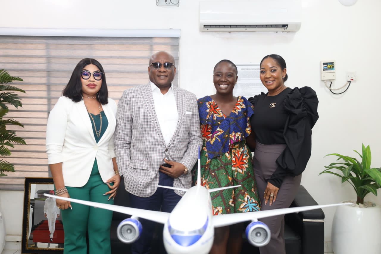 From left: Oluwatoyin Olajide, Chief Operating Officer, Air Peace; Dr Allen Onyema, Chairman, Air Peace; Miss Pelumi Nubi, Travel Content Creator; and Ejiro Eghagha, Chief of Administration and Finance, during Pelumi’s courtesy visit to Onyema at the airline’s head office in Lagos.